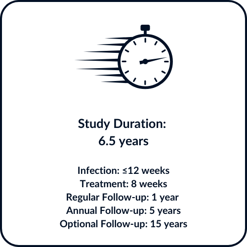 Active participation in the study is approximately 12 weeks, followed by 8 weeks of treatment. 4 follow-up visits will occur in the year after treatment with yearly follow-ups will continue for an addition 5 years.
